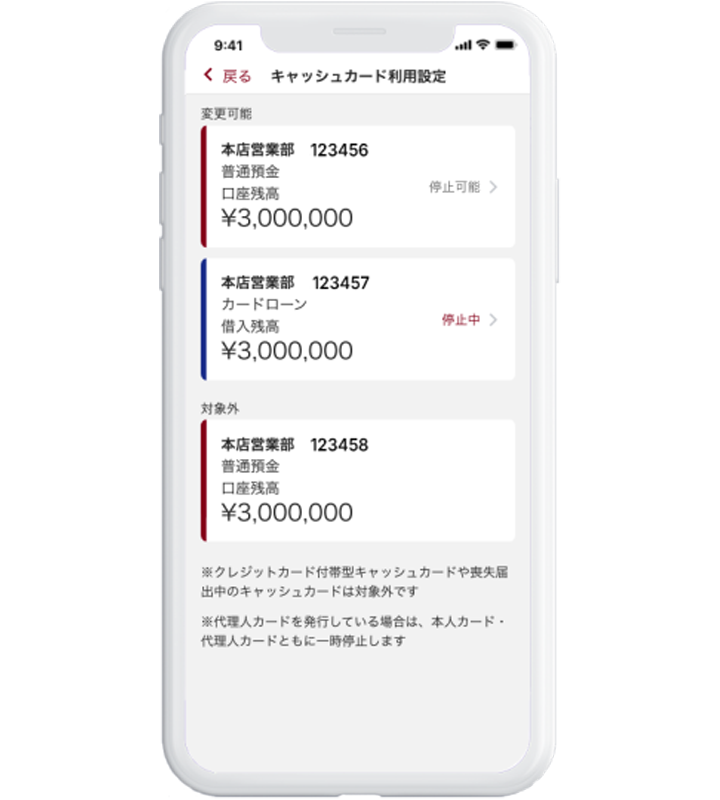 キャッシュカード、ローンカードが対象です。普段は一時停止しておき、ご利用の時だけ停止解除することで、安心してご利用いただけます。