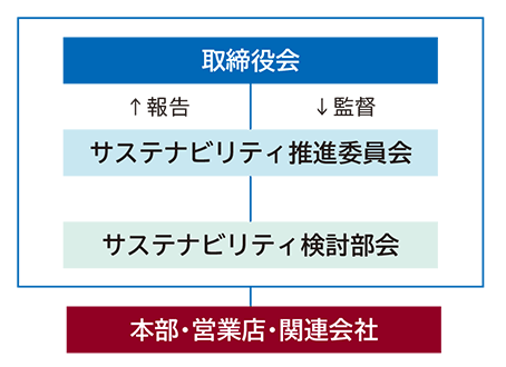 2022年3月、サステナビリティに関わる全行的取組みを統括・推進する専門組織として、総合企画部内に「サステナビリティ推進室」を設置しております。地元企業のサステナビリティ経営支援、より主体的・先導的な地方創生・地域活性化に取組むとともに、先鋭化する気候変動・生物多様性などの環境問題やDE&Iといった課題についても、同室が中心となり組織横断的に3つの分科会(地域経済活性化、地域社会活性化、環境・ダイバーシティ)を組成して取組んでおります。