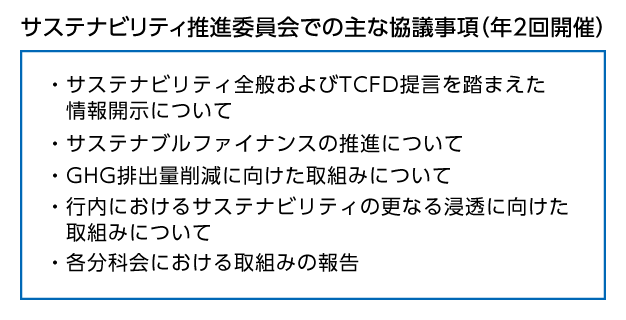 また、その下部組織の「サステナビリティ検討部会」において企画立案、進捗管理等を行い、定期的に取締役会へ報告すること としております。これにより、取締役会がサステナビリティ関連の取組みを監督する態勢を構築しております。同委員会は、頭取をはじめとする取締役及び本部部長をメンバーとして、総合企画部サステナビリティ推進室が事務局となり、気候変動を含む環境や社会に係る機会及びリスクへの対応方針や取組計画等を年2回定期的に協議しております。