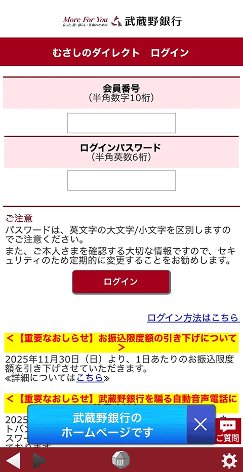 - 「むさしのダイレクトアプリ」を起動し、「会員番号」と「ログインパスワード」を入力し、ログインします。