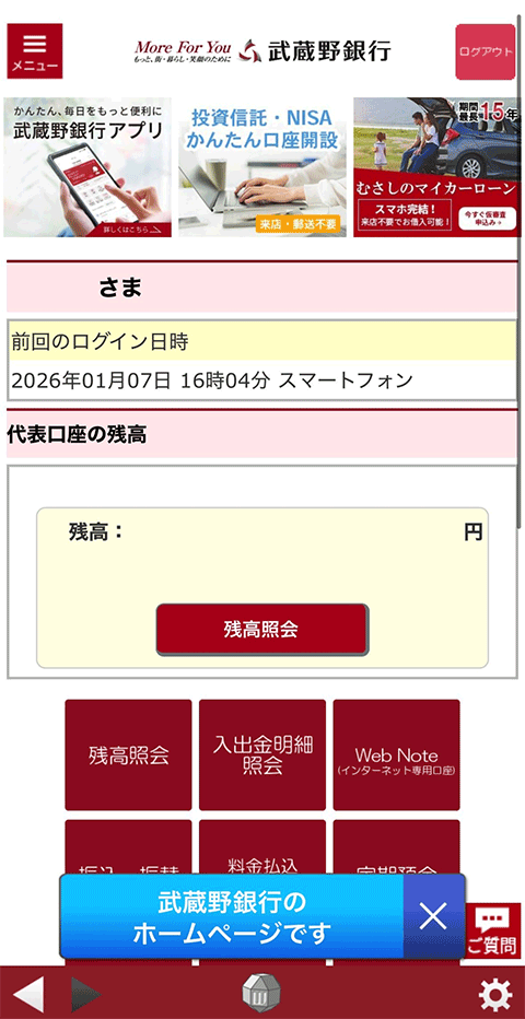 - 「むさしのダイレクト」(インターネットバンキング)のご利用には、別途お申込みが必要です。また、「むさしのダイレクト」にはご利用いただけない時間帯やお取扱いできないサービス内容があります。サービス内容やご利用可能な時間帯など、詳しくはこちらをご確認ください。