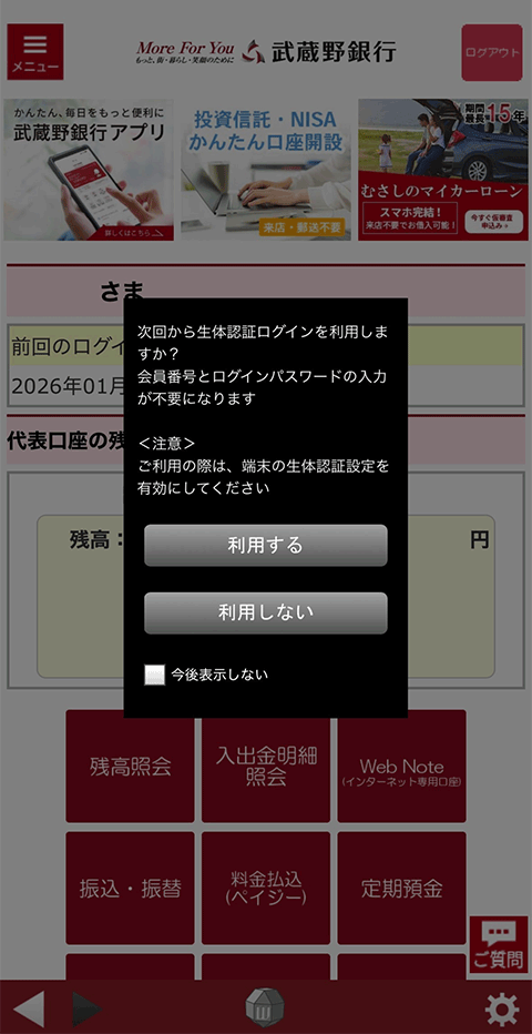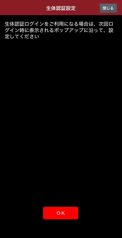 - ログイン後ポップアップが表示されるため、「利用する」をタップすると、次回ログイン時から、生体認証を使用してログインすることができます。