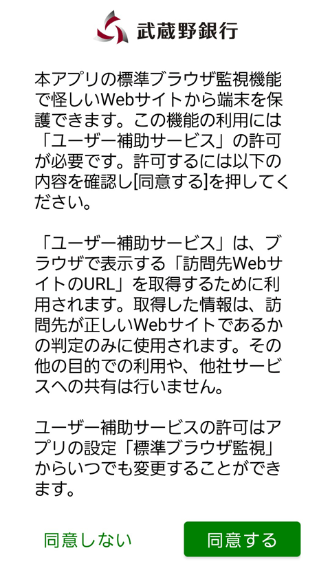 - 「むさしのダイレクトアプリ」を起動させます。内容をよくご確認いただき、「同意」をタップします。