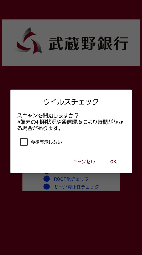 「むさしのダイレクトアプリ」が正規であるか、不正な改ざんがされていないかをチェックします。