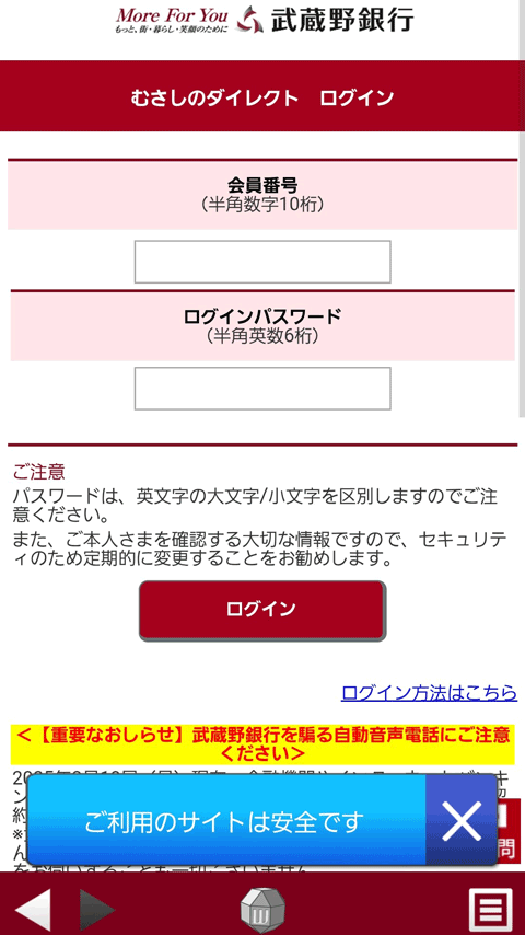 「むさしのダイレクトアプリ」を使用することで正規の「むさしのダイレクト」にアクセスでき、「武蔵野銀行のホームページです(iOS)」や「ご利用のサイトは安全です(Android)」と表示され、フィッシング対策が可能です。 - 情報漏えい対策